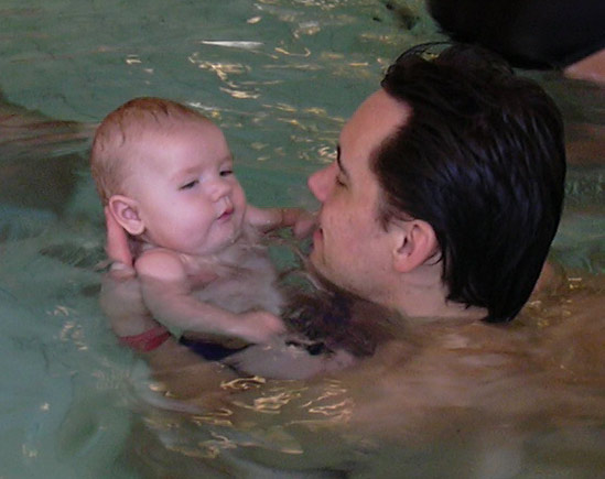 Här är William och pappa Richard i färd med babysim. Båda verkar trivas.